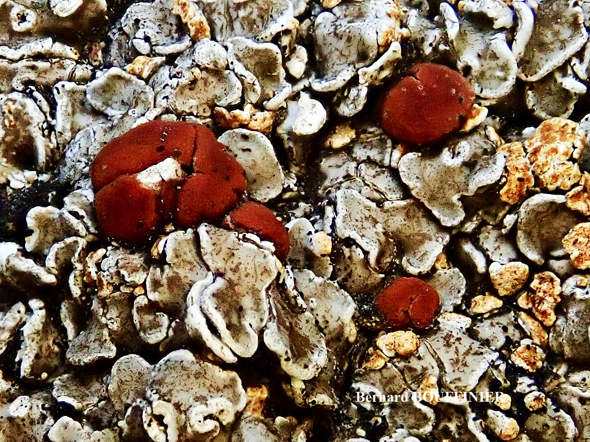 Biatorine marginal apothecia generally present, sessile, simple or grouped, 1-3 mm in diameter, convex disc, rust-red, orange, margin barely visible and insignificant.