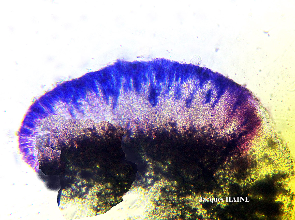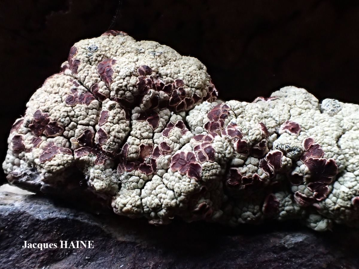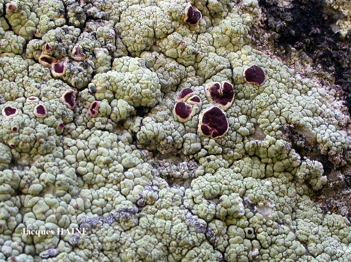 Thallus crustose, well delimited, rather thick, surrounded with large areoles more or less rounded with a warty surface, yellowish white, pale yellowish for the form with usnic acid: forma ventosa and whitish for the form without usnic acid forma subfestiva. Apothecia usually quite abundant, lecanorins, 1-4 mm in diameter, initially flat disc sometimes bulging in old age, not pruinose, bright red, scarlet red, blood red, rim sharp, sinuous, may be reduced in old age, concolorous to the thallus. Spores colorless, with one rounded end and another pointed, 3-7 septate, 40-50 x 4-5 µm. Presence of pycnidia with black ostioles, pycnospores 5-10 x 1 µm. Photobiont: Trébouxia. Cortex and medulla: K + yellow, KC +/- yellow, P + orange but there are K- and P- chemoforms. Mountain species coming on non-calcareous rocks very exposed, in particular to the wind.