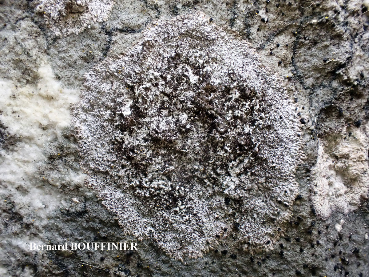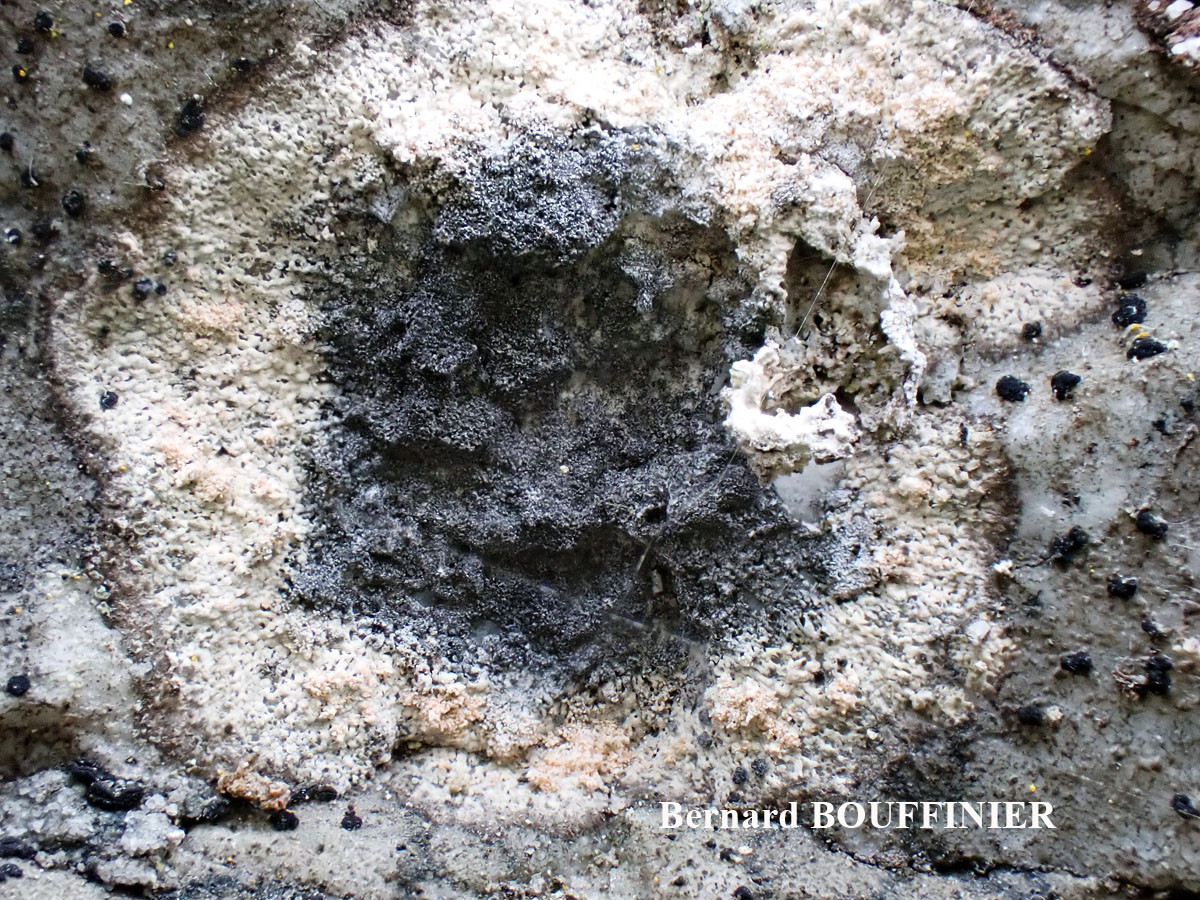On this host, at first small black spots may be seen towards the thallus center and a centrifugal infestation is then observed that invades the whole thallus and completely destroys it at the end of the process. Rather common on this host in this type of habitats: here an old sheltered wall on the North side of a chapel.