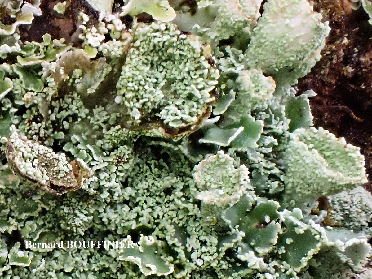 Cette forme se caractérise par sa venue sur les vieux murs moussus humides. La marge blanche des lobes est d'aspect très sorédié et comme couverte de farine par ce qui semble être des phyllidies qui peuvent également couvrir leur surface supérieure comme des flocons de neige.